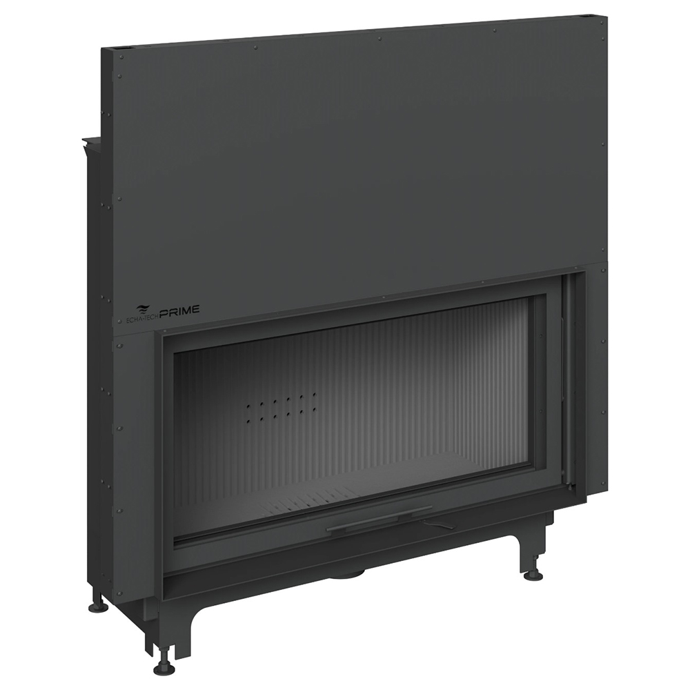 Foyer fermé en acier avec porte relevable. Système de double combustion étanche. Intérieur en fonte, option vermiculite ou céramique.
